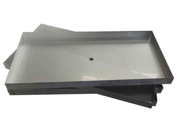 This stainless steel drip tray is designed with precise dimensions, as it needs to be welded into a frame. The bottom features crossed embossing lines created by a bending machine, forming a drainage slope. This ensures that the center drainage hole is the lowest point, allowing water to flow out efficiently from the center.